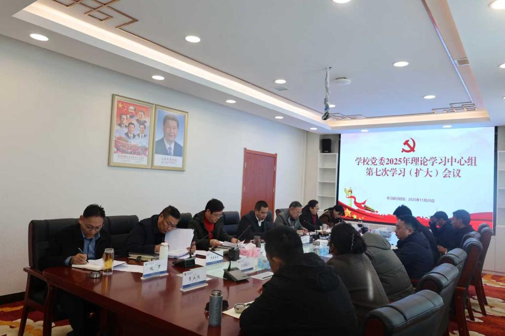 11月20日下午,学校召开党委理论学习中心组2025年第七次学习(扩大)会议,校党委书记鞠明兵作党的二十届四中全会精神宣讲,进行全会精神专题学习研讨。学校党委班子成员王斌礼、黄国慧、边巴仓决、多杰仁青、达罗、尼玛普赤出席,全校县处级以上领导干部、各直属科级部门负责同志参加会议。